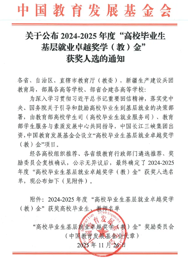 我校毕业生荣获2024-2025年度“高校毕业生基层就业卓越奖学金”
