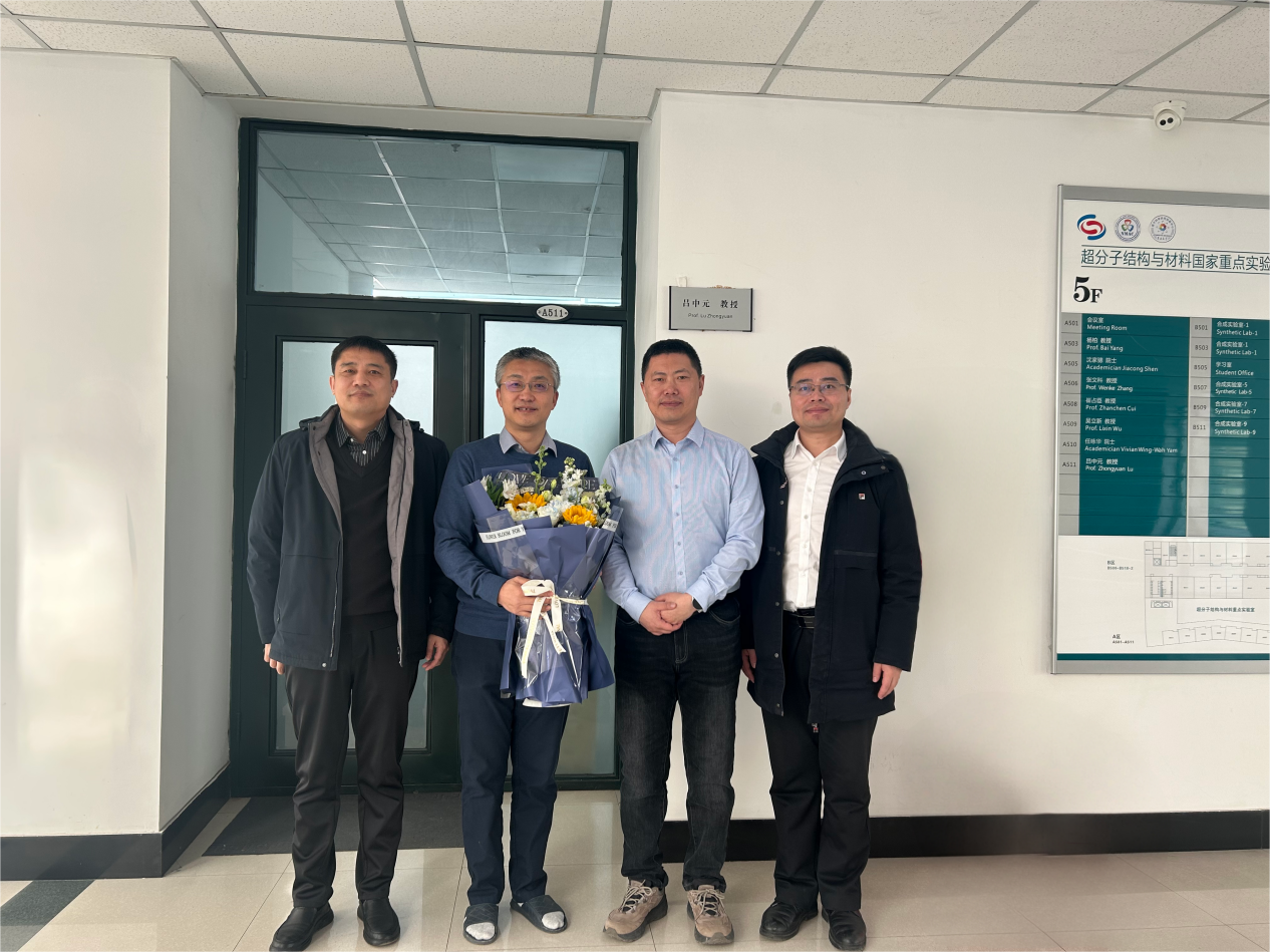 在孙俊奇教授办公室中,马本华、李乙一行首先对超分子结构与材料全国重点实验室顺利重组表示祝贺,对孙俊奇教授长期以来为化学学科的发展做出的贡献表示感谢。孙俊奇表示,全国重点实验室的重组是学科发展的新起点,挑战与机遇并存。未来,实验室将进一步优化学科方向布局,筑巢引才,加强与国内外顶尖科研院所的合作交流,形成多元化学术氛围,切实提升实验室综合发展实力,履行全国重点实验室的职责与使命,为化学学科的发展做出新的更大贡献。