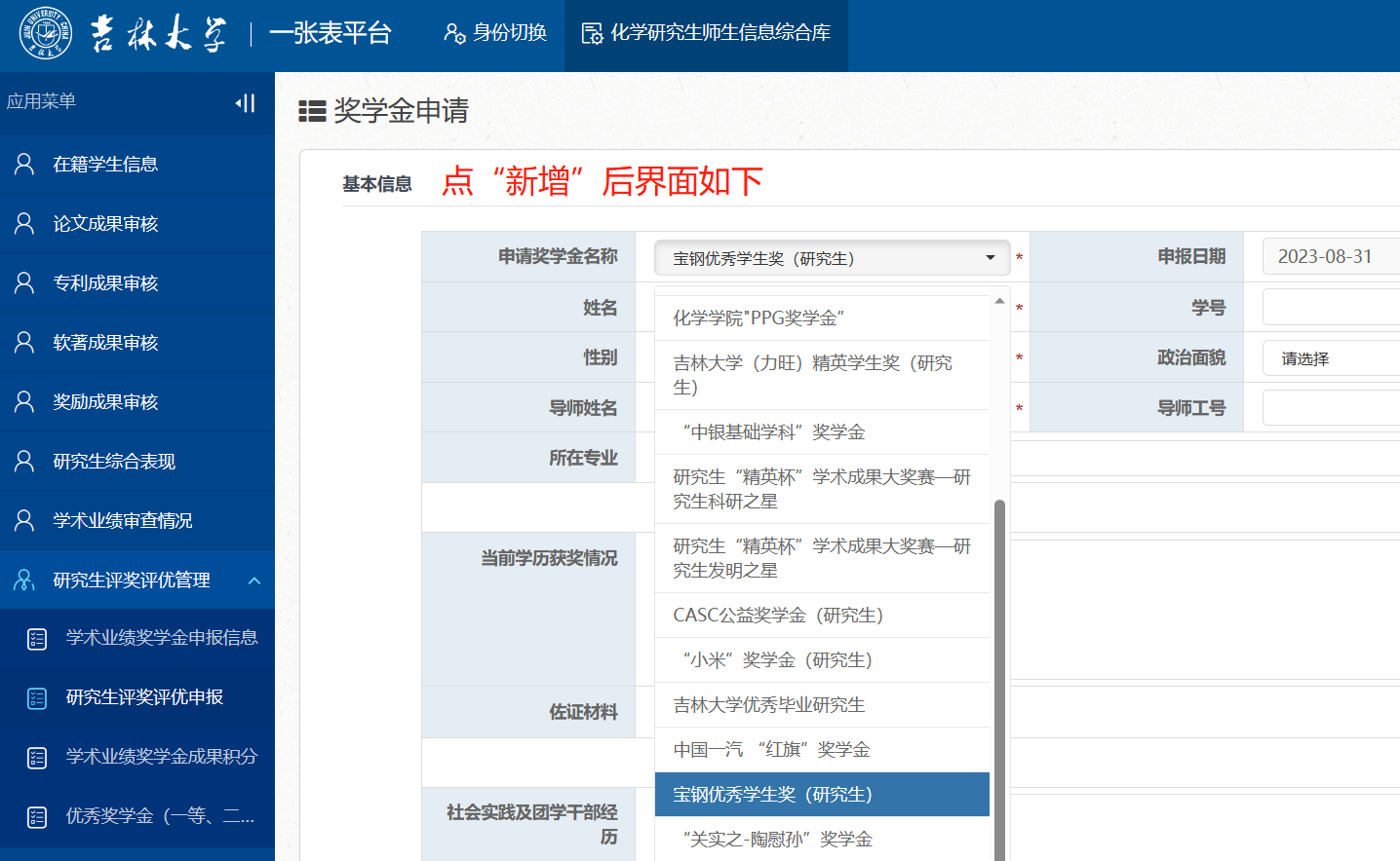 纸质版申请表及作证材料:请于9月5日前交至中心校区唐敖庆楼A201助管处;同时申报研究生于9月5日前,使用个人邮箱账号登录“一张表”平台(https://one.jlu.edu.cn),在“研究生评奖评优管理”-“研究生评奖评优申报”栏,点击“新增”进行信息填报及佐证材料上传,其中成果信息只需要输入“姓名或者学号”,然后在已审核通过的成果库中选择不超过3篇代表作参评。