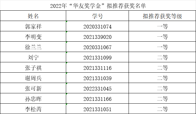 按照776net必赢官网2022年“华友奖学金”评选工作安排,经研究生申报、研办审核、专家评选,拟推荐获奖名单公示如下,如有异议请与赵晓杰老师联系,联系电话13504470223。