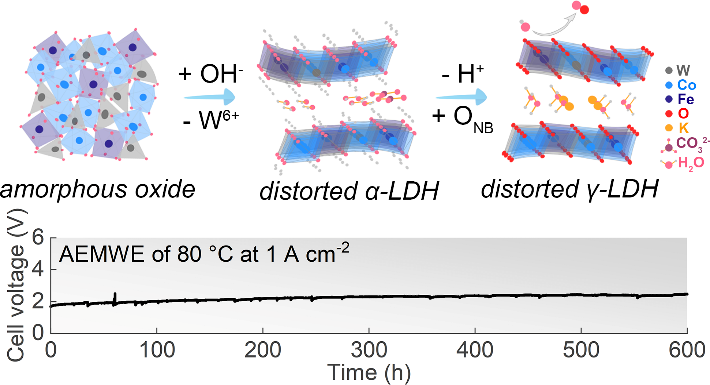 针对上述问题,776net必赢官网李广社教授和李莉萍教授团队通过高氧化态掺杂策略,合成了一种W6+掺杂的Co-Fe非晶氧化物,实现了活性和稳定性的双重优化。W6+的引入使结构非晶化,引起电荷再分布,并改变了键合性质。这导致催化剂在工况下发生自发和电化学体相重构,完全演变为活性的γ-层状双金属氢氧化物结构。重构过程中,Co和Fe位点产生了局部结构的不均匀性,在电场作用下产生活性的非键氧态,触发晶格氧机理,降低了反应起始电位,实现了Co3+催化的析氧反应。随着电位的进一步提升,反应机理发生转变,由低电位下的晶格氧机理转变为高电位下的吸附演化机理。这一电位依赖性的机理转变使催化剂在阴离子交换膜水电解槽中以1.69V的槽压实现1000mA cm-2的电流密度并至少稳定运行600h。