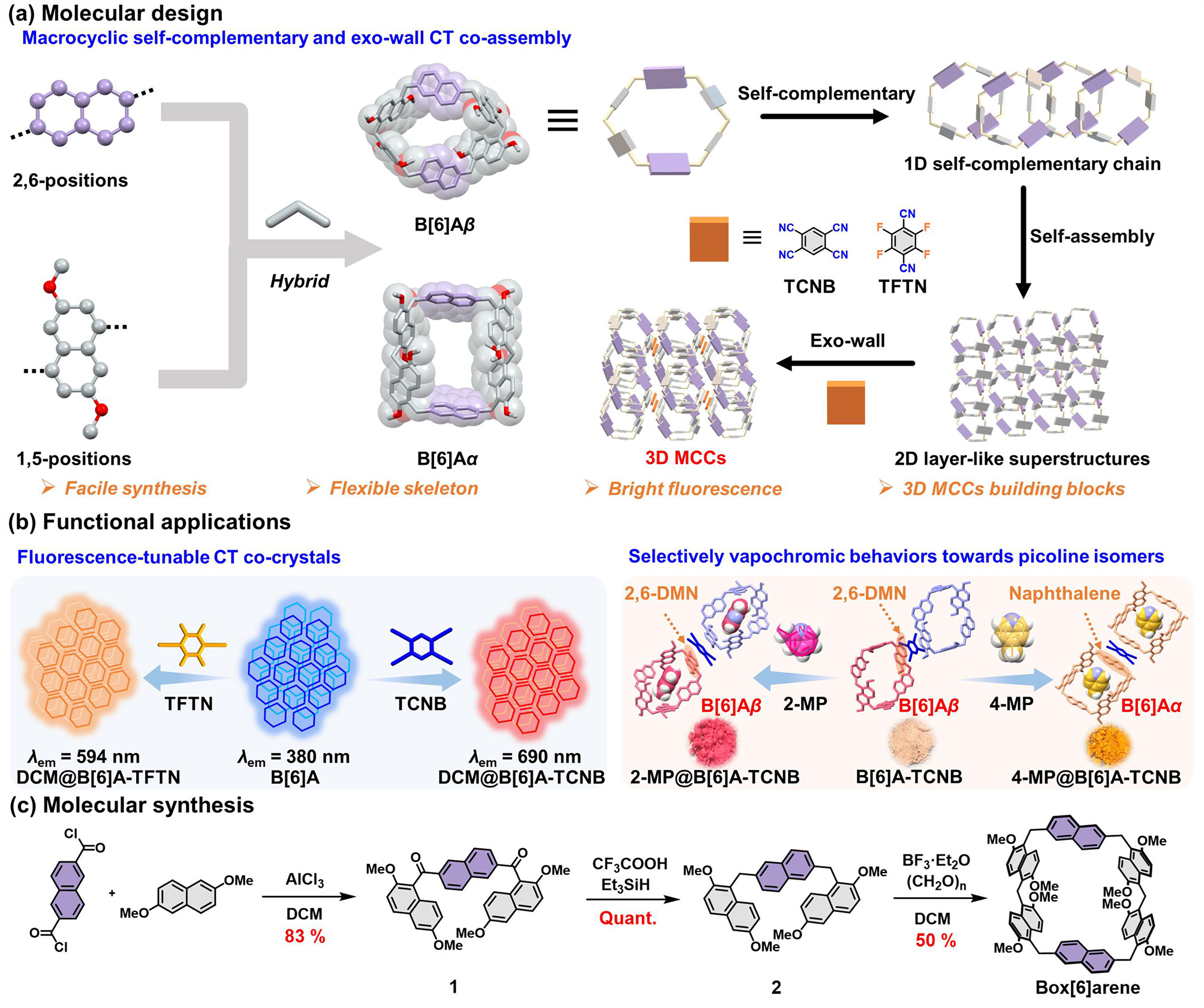 大环芳烃是超分子化学理论与应用研究的重要工具,设计合成结构新颖、性能优异的大环芳烃始终是该领域面临的重要挑战之一。此外,传统大环基共晶组装策略的维度局限严重限制了结构明确的功能三维电荷转移(CT)共晶的构建。