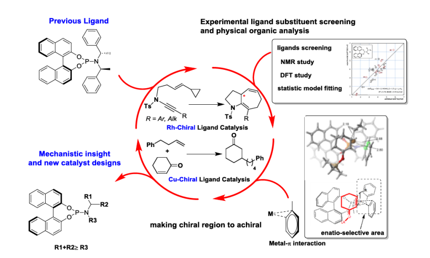 Through computational quantum chemistry we have explored how the structural elements of the phosphoramidite ligand affect catalyst structure and selectivity in Rh-catalysed asymmetry cycloisomerization and Cu-catalysed conjugate additions. Elucidation of the important interactions has been achieved by studying the effects of ligand-structural variation on both the catalyst structure and resulting enantioselectivity, through a combination of experimental and theoretical techniques. These studies illustrate the ability of quantitative structure-selectivity relationships to provide both models for asymmetric induction and catalyst structural hypotheses that may be further probed by experiment and computation. Collectively, such an approach leads to the rational modification/simplification of chiral ligands for more effective catalysts.