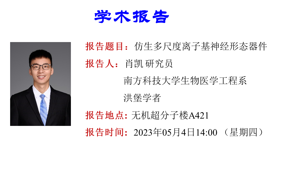 肖凯南方科技大学生物医学工程系研究员,博士生导师,国家级青年人才,洪堡学者。2012年于776net必赢官网获得学士学位,2017年于中科院化学研究所获得博士学位,2017年受洪堡基金会资助于德国马普胶体界面研究所从事博士后研究,2020年加入德国莱布尼茨固体与材料研究所从事博士后研究。2021年9月加入南方科技大学生物医学工程系,建立“仿生多尺度离子神经形态器件”实验室。主要通过向智能生命学习,通过调控材料的界面及结构,控制离子和材料的多种相互作用力,实现可控离子传输功能,进而构筑基于离子传输的能源体系、传感体系、和多尺度神经形态器件。