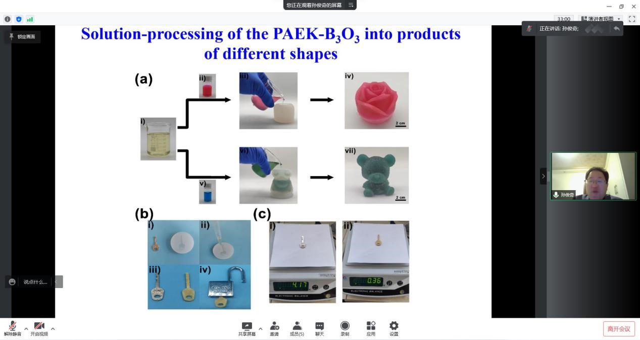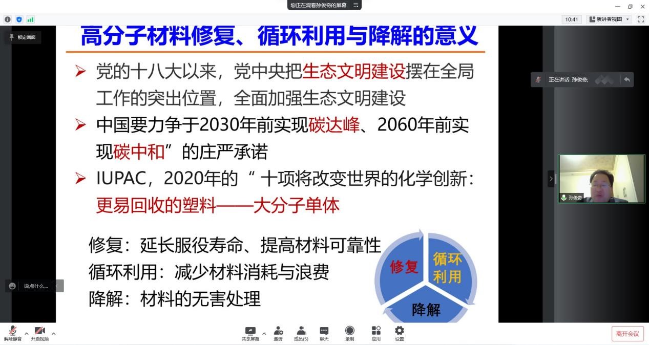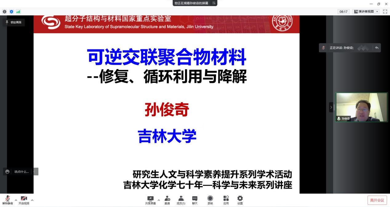 3月27日上午,必赢举办了“吉大化学70年院庆系列活动—科学与未来系列讲座”,本期讲座邀请了孙俊奇教授作主题为“可逆交联聚合物材料:修复、循环利用与降解”的线上学术报告。