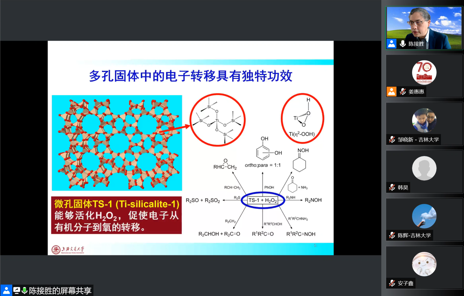 讲座中,陈接胜教授围绕固体中电子转移及催化,深入浅出地分享了其课题组在微孔晶体中制备单核一价锌,开辟非常规价态金属中心构筑新路线,获得新型高效催化活性位点的研究;介绍了通过界面电子转移策略提升金属催化活性,发展一系列性能优异复合固体催化材料的新思路。在交流互动环节,陈接胜教授耐心详细地解答了院内外师生的问题,并对相关领域的发展做出了展望。776net必赢官网、无机合成与制备化学国家重点实验室、超分子结构与材料国家重点实验室等单位负责人参加讲座,院内外200余名师生在线收看。