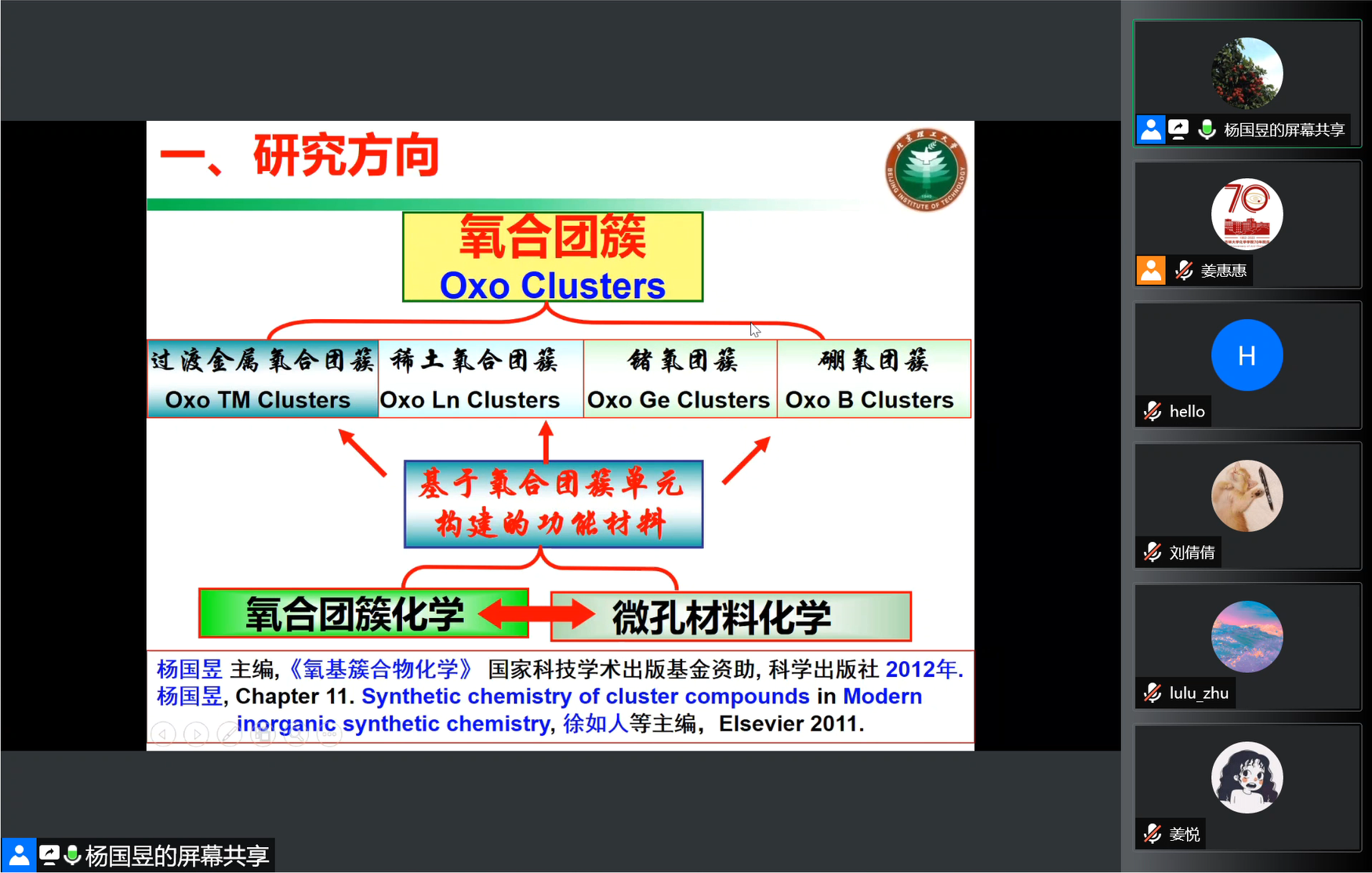 讲座中,杨国昱教授围绕氧合团簇化学,全面地介绍了其课题组在过渡金属氧簇、稀土氧簇、锗氧团簇及硼氧团簇等氧合团簇合成领域的研究进展。在交流互动环节,杨国昱教授耐心详细地解答了院内外师生的问题,并对相关领域的发展做出了展望。776net必赢官网、无机合成与制备化学国家重点实验室、超分子结构与材料国家重点实验室等单位的师生参与交流。