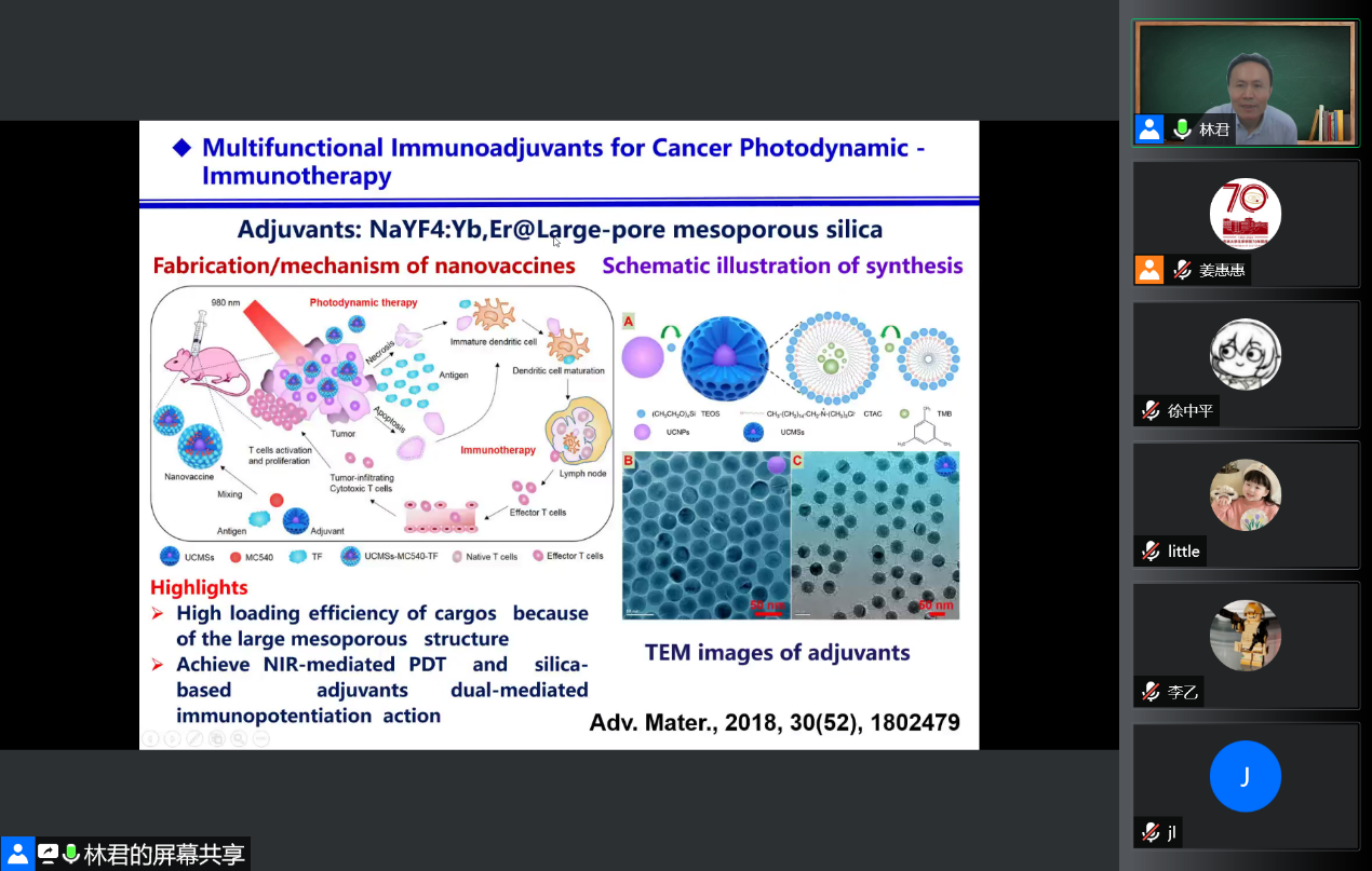 讲座中,林君研究员围绕多功能稀土发光材料的控制合成、性能调控及其生物医学应用,深入浅出地分享了其课题组多年来在稀土发光材料的控制合成、形貌调控及其在生物医学领域应用方面的研究工作,重点介绍了利用上转换发光材料激活光敏剂和药物等进行肿瘤治疗,以及制备多功能药物载体、将多种治疗模式结合在一起来提高肿瘤的治疗效果等工作。在交流互动环节,林君研究员耐心详细地解答了院内外师生的问题,并对相关领域的发展做出了展望。776net必赢官网、无机合成与制备化学国家重点实验室、超分子结构与材料国家重点实验室等单位的师生在线参与讲座。