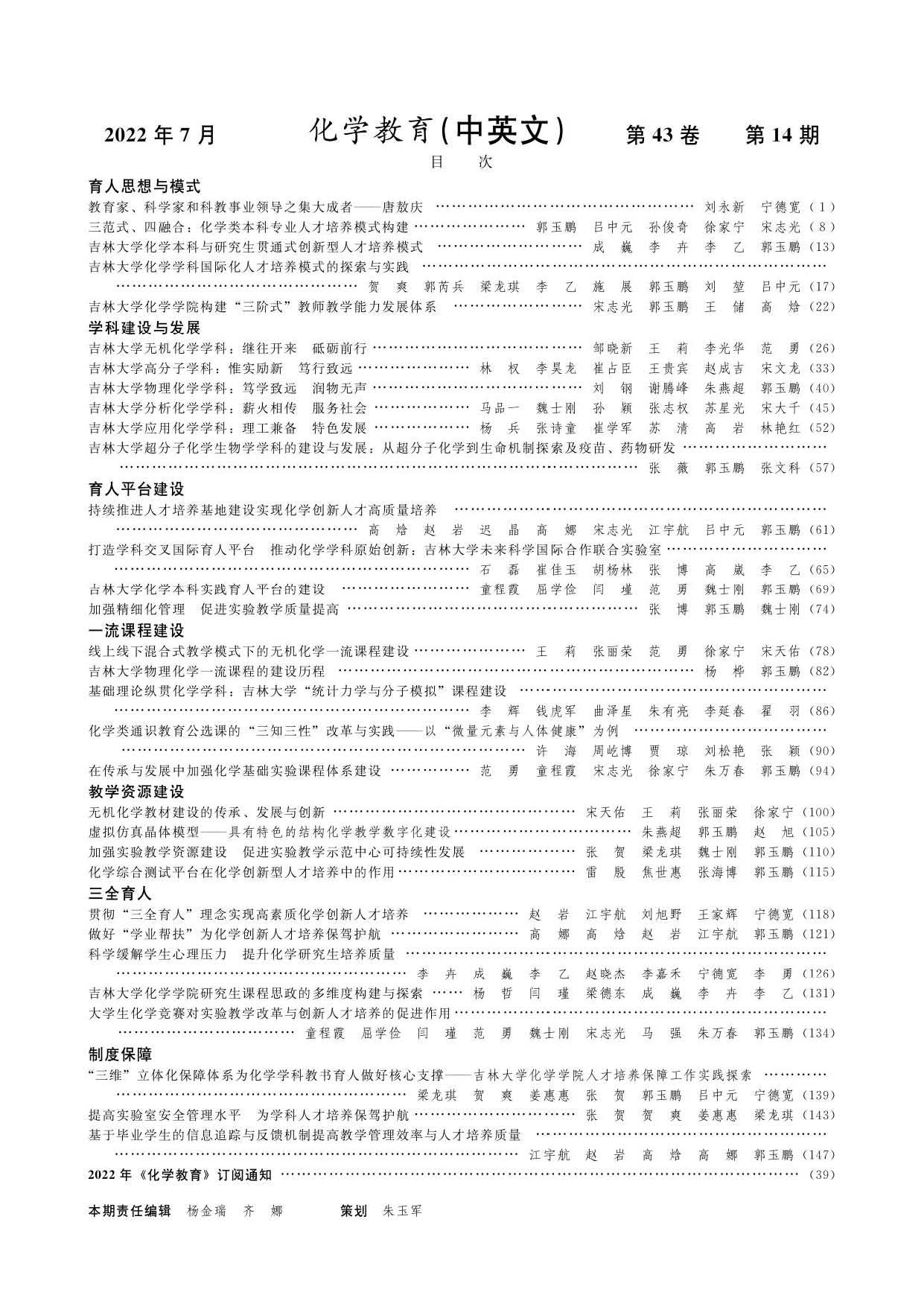 2022年正值776net必赢官网化学学科创建70周年,《化学教育》精心推出庆祝专刊,共设育人思想与模式、学科建设与发展、育人平台建设、一流课程建设、教学资源建设、三全育人、制度保障等七大版块。通过32篇文章,全方位、多角度展示了学科在先进教育理念、高水平学科建设、特色人才培养模式、高素质师资队伍建设、育人资源与平台建设等方面取得的成就,以及对未来高水平交叉复合型化学创新人才培养的探索。