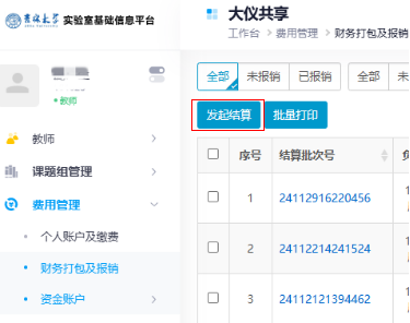 3. 在进入后的页面中点击左侧“费用管理”下“财务打包及报销“选项,点击“发起结算”。