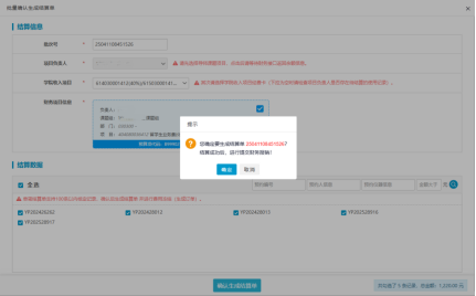 4. 在弹出的结算信息页面中,完成*内容填写,并勾选结算数据,最后点击“确认生成结算单”。