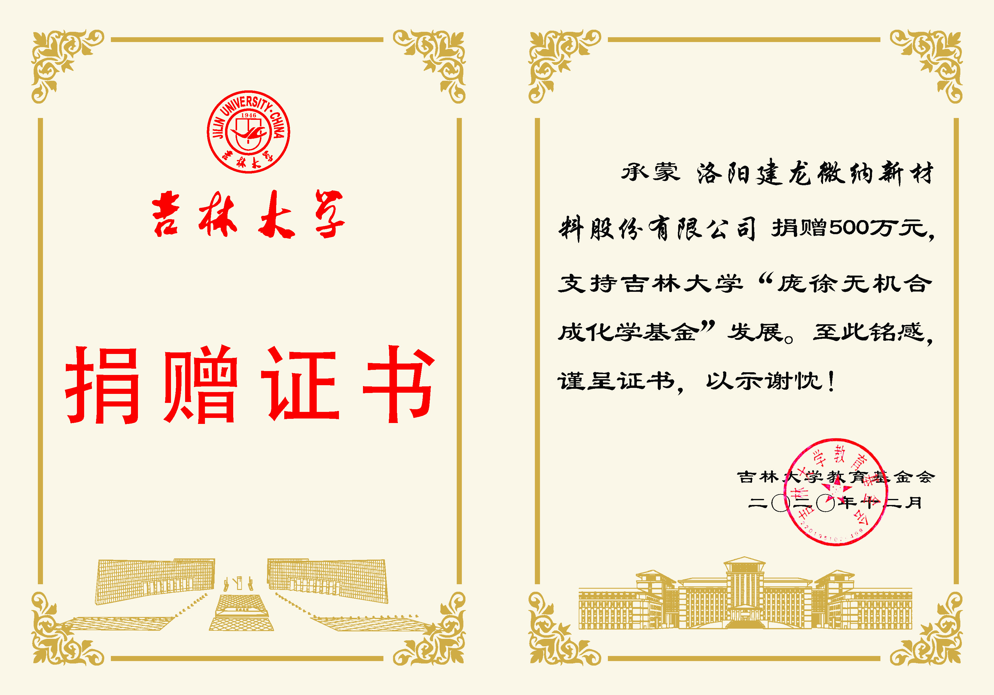 承蒙洛阳建龙微纳新材料股份有限公司捐赠500万元,支持776net必赢官网“庞徐无机合成化学基金”发展,至为铭感,谨呈证书,以示谢忱!