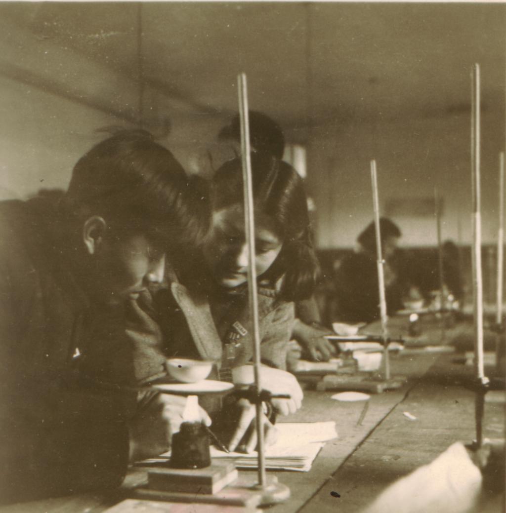 图9:建系初期,学生用“墨水瓶做的酒精灯”和“木板条拼成的实验台”做实验