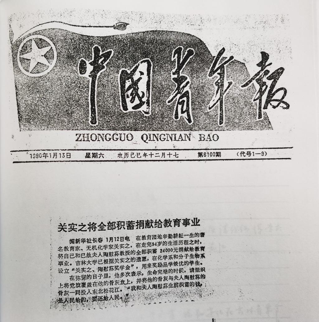 1982年12月,陶慰孙教授去世。按照陶慰孙教授的遗愿,关实之于1983年将夫妇二人一生的积蓄2.4万元无私地捐献给学校。在上世纪80年代初,一个普通大学老师的月工资不过百元,2.4万元称得上是一笔巨资。经学校研究决定,在化学系设立“关实之、陶慰孙奖学基金”,用于奖励品行兼优的学子,以彰显关、陶二位教授为教育事业所做出的贡献。关实之的善举在当时引起了较大的社会反响,《中国青年报》以“关实之将全部积蓄捐献给教育事业”为题报道了此事。至今,一些曾受惠于关实之教授和“关陶”奖学金的776net必赢官网化学系学子们仍然怀念关实之教授和陶慰孙教授。