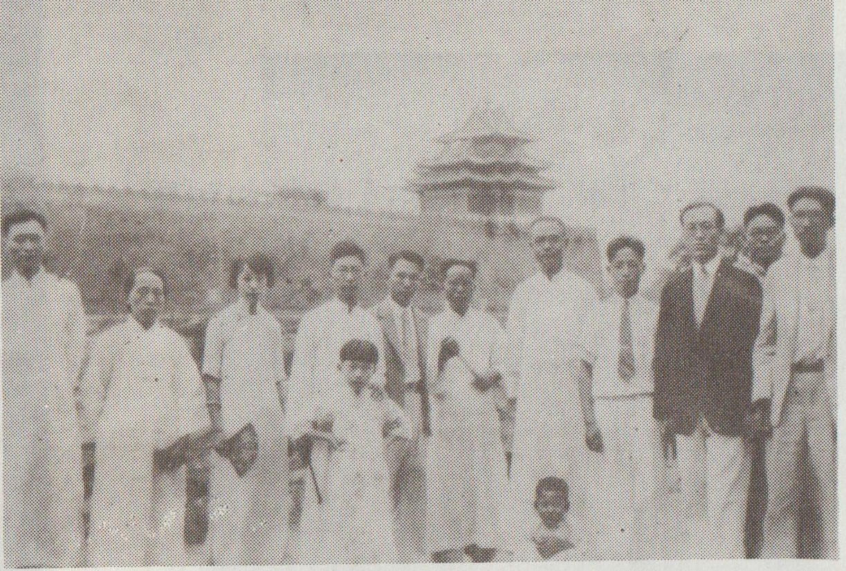 图3:1952年夏,关实之(右4)、老舍(左4)与友人在故宫筒子河前合影