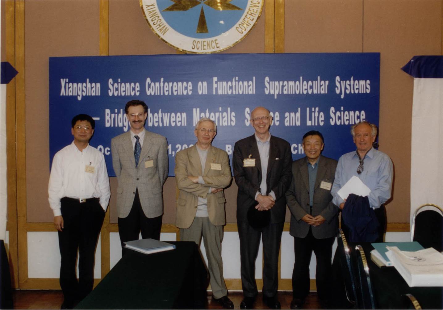 图7:2001年,主办功能超分子体系“香山科学会议”(左起:776net必赢官网张希教授、德国A. Laschewsky教授、法国J. M. Lehn教授(诺贝尔奖获得者)、美国G. Whitesides教授、776net必赢官网沈家骢教授、德国H. Ringsdorf教授)